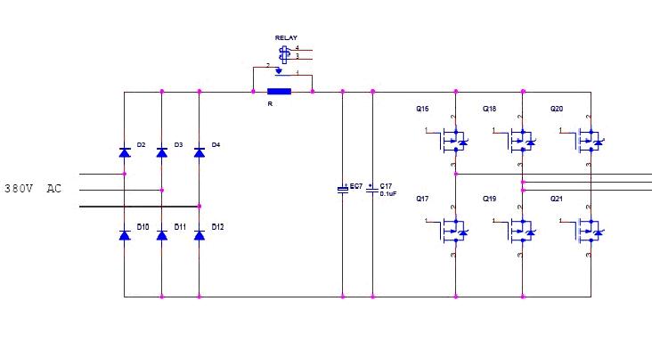大家可以看出圖上標(biāo)出15KW的地方,就是我們的繼電器應(yīng)用的地方,一般在15KW以下的變頻器上的保護(hù)工作都是由繼電器來完成的,大于15KW的變頻器都是用接觸器來保護(hù)的,繼電器主要完成的作用為,大家知道當(dāng)電機(jī)啟動(dòng)會(huì)有一個(gè)很大的沖擊電流,為了對變頻器進(jìn)行保護(hù),先用繼電器把這個(gè)大的沖擊電流擋住,也就是繼電器處于常開狀態(tài),等電流恢復(fù)到正常,繼電器關(guān)閉,把那個(gè)電阻短路,所以此處的繼電器一般都是需要電流比較大的,例如omron的G8P型繼電器,由于此處繼電器對電機(jī)有比較重要的作用,所以一般客戶都會(huì)選擇質(zhì)量較好的繼電器,有用OEG的,有泰科的,也有松川的。如果在15KW以上的變頻器,一般客戶不會(huì)選擇用繼電器來保護(hù),由于沖擊電流太大,一般客戶會(huì)選擇接觸器來保護(hù),但是接觸器的價(jià)格要比繼電器貴的多。還有一個(gè)地方,就是變頻器上都會(huì)有給客戶留的無源觸點(diǎn),這個(gè)地方會(huì)用繼電器當(dāng)開關(guān)使用。