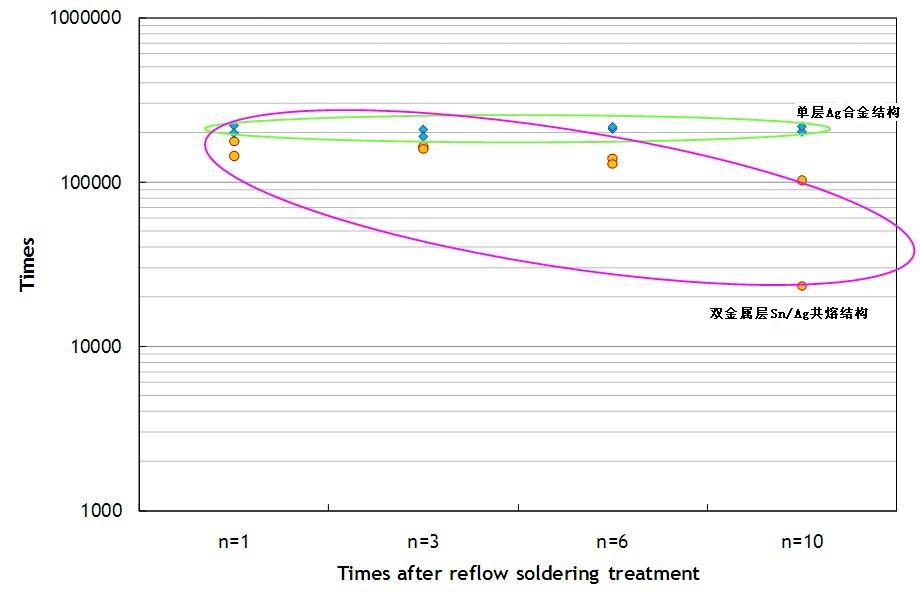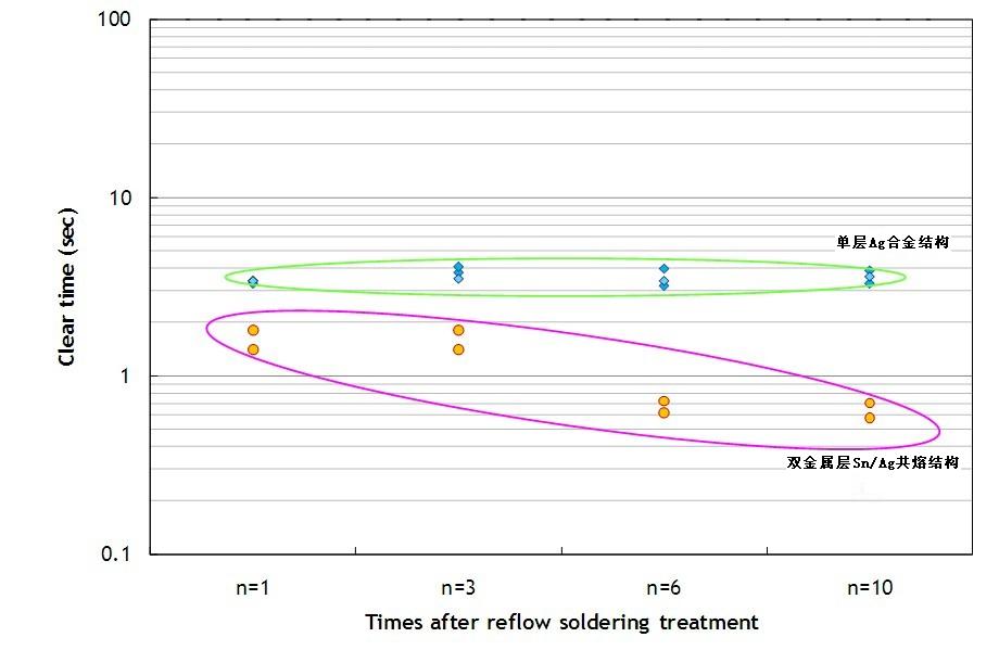 單層Ag合金結(jié)構(gòu)的保險(xiǎn)絲即使經(jīng)過多次高溫?zé)崽幚恚钥梢跃S持較穩(wěn)定的熔斷時(shí)間。但是雙層Sn/Ag共熔結(jié)構(gòu)的保險(xiǎn)絲,其熔斷時(shí)間有明顯變快的趨勢。