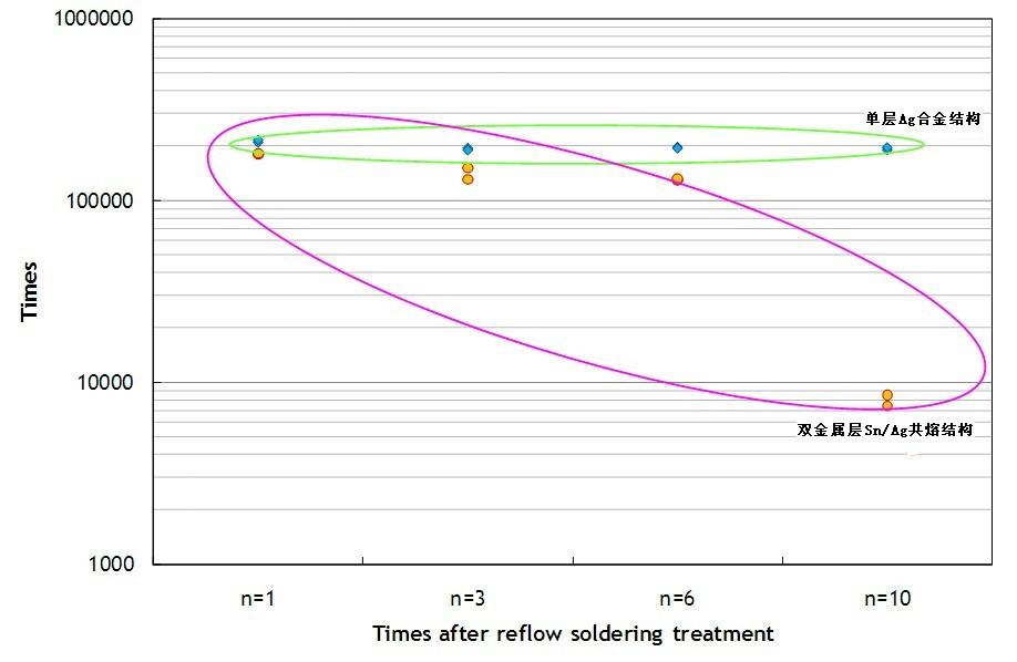 單層Ag合金結(jié)構(gòu)的保險(xiǎn)絲即使經(jīng)過多次高溫?zé)崽幚?,仍可以維持一定的耐脈沖能力,承受脈沖次數(shù)都可達(dá)十萬次以上。但是雙層Sn/Ag共熔結(jié)構(gòu)的保險(xiǎn)絲,其承受脈沖能力有明顯下降的趨勢,在經(jīng)過10次回流焊錫爐熱處理后,承受脈沖次數(shù)就會下降到十萬次以下。