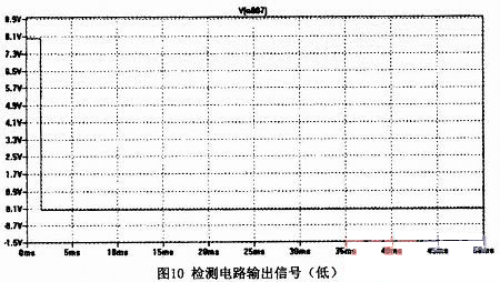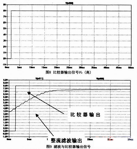 整流濾波后的信號V2,輸入到比較器IC4的正信號端,與IC4的負(fù)端電壓(V3=Vcc/2=4V))進(jìn)行比較。當(dāng)信號電平值大于4V時,比較器輸出高電平(V4接近運(yùn)放的電源8V),當(dāng)信號電平值小于4V時,比較器輸出低電平(V4接近0V),該兩個電平將控制后級檢測電路。圖8為AUX輸入信號后經(jīng)比較器輸出高電平的仿真輸出,圖9為濾波和比較器的仿真輸出信號。