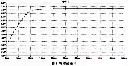 整流電路由D1、R10、C6組成(參見圖6)。它起到了平緩放大后信號的變化幅度,使它接近直流信號的作用。當(dāng)V1和V2之間的壓差大于二極管的導(dǎo)通電壓時,二極管導(dǎo)通,對電容C6充電(同時一部分電流流過R10及比較器的輸入阻抗);當(dāng)V1和V2的壓差小于二極管的導(dǎo)通電壓時,二極管截止,電容上的電荷通過R10(及比較器的輸入阻抗)放電。當(dāng)放電到V1和V2的壓差再次大于二極管的導(dǎo)通電壓時,二極管導(dǎo)通,又開始充電的過程。該電路就反復(fù)地進(jìn)行這樣的充放電過程。由于R10、C6值都很大,放電的速度很慢,電容電壓接近直流。由微分方程可得,放電時間T=RC1n(Vo/Vt),Vo為放電初始電壓,Vt為放電后的電壓,R為放電通路的電阻值,C為放電的電容值。可見R,C越大,放電時間越長,即電壓越不容易變化。圖7為整流濾波的仿真輸出。