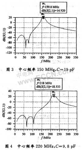 通常,電調(diào)諧濾波采用雙極點調(diào)諧濾波,諧振回路分為串聯(lián)諧振回路和并聯(lián)諧振回路,通過電感或電容進行耦合。此電調(diào)濾波器采用的是并聯(lián)諧振回路,用電感進行耦合。在進行仿真之前,需要建立仿真模型和設(shè)計各種參數(shù)?;谝陨夏P停肁DS軟件對電調(diào)濾波器進行電路設(shè)計和仿真。由于系統(tǒng)要求對該電調(diào)濾波器進行AGC控制,所以在仿真時加入雙柵FET。傳輸函數(shù)S21、頻率范圍設(shè)在10~350 MHz、電容在2.6~39 pF之間變化,仿真使用的放大器是NE25118。最終的ADS模型仿真結(jié)果如下面兩組曲線所示。若LC濾波器不使用放大器,仿真結(jié)果中可以看出濾波器的插損在2~3 dB左右。