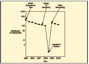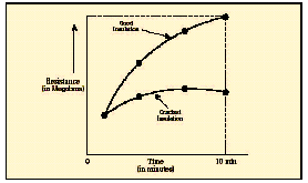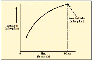 在短時(shí)測(cè)試中,兆歐表被直接跨接在被測(cè)設(shè)備上,施加大約60秒的測(cè)試電壓。為了在大約一分鐘的時(shí)間內(nèi)使絕緣值讀數(shù)達(dá)到穩(wěn)定,應(yīng)該只對(duì)低容性的設(shè)備進(jìn)行該項(xiàng)測(cè)試?;镜倪B接步驟和驗(yàn)證測(cè)試時(shí)相同,所施加的電壓按DC測(cè)試電壓公式進(jìn)行計(jì)算。當(dāng)測(cè)試好的設(shè)備時(shí),您會(huì)注意到,隨電容容量和吸收電流的降低,絕緣阻抗值會(huì)穩(wěn)定上升。由于溫度和濕度會(huì)影響測(cè)試結(jié)果,應(yīng)該在標(biāo)準(zhǔn)溫度(大約20?C/68?F)下、露點(diǎn)之上的環(huán)境下進(jìn)行測(cè)試。 當(dāng)設(shè)備的額定值等于或小于1000伏特時(shí),絕緣讀數(shù)應(yīng)該為1MΩ或更高。當(dāng)設(shè)備額定值高于1000伏特時(shí),理想的阻抗應(yīng)該為每1000伏特上升1MΩ。所測(cè)量的絕緣阻抗值通常會(huì)略低于以前記錄的值,其下降的趨勢(shì)規(guī)律如圖6所示。絕緣值下降的斜率是絕緣材料老化程度的正常信號(hào)。陡峭的下降斜率是絕緣失效或可能出現(xiàn)故障的先兆。