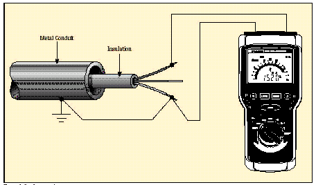 當(dāng)測(cè)試配線或電纜時(shí),應(yīng)將其從操作板或機(jī)器上斷開,保持隔離。應(yīng)該在電線或電纜之間或其和地之間進(jìn)行測(cè)量(參見第4頁的圖4)。IPCEA(Insulated Power Cable Engineers Association)提供下列公式,推薦了最小的絕緣電阻值。 R = K x Log10 (D/d) 表10. 電纜絕緣電阻 R -每1000 英尺 (305 米)電纜的阻抗,單位為MΩ?;?00伏特的DC測(cè)試電壓,在15.6?C (60?F)的溫度下通電1分鐘。 K-絕緣材料常數(shù)(例如,絕緣浸漬紙-2640, 漆包布鉛皮-2460, 熱塑聚乙烯材料-50000,合成聚乙烯-30000)