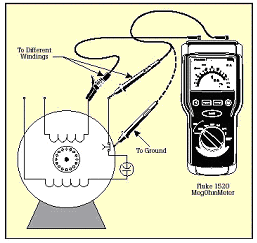 當(dāng)測(cè)試定子馬口鐵的阻抗時(shí),要確保定子繞組和定子相是斷開的。測(cè)量繞組之間以及繞組和地之間的絕緣電阻。還有,當(dāng)測(cè)量DC發(fā)電機(jī)或馬達(dá)時(shí),應(yīng)該將電刷提高,這樣,就能將馬口鐵和電樞分開來測(cè)量。下表列出了推薦的在不同的馬達(dá)額定電壓下的最小阻抗讀數(shù)