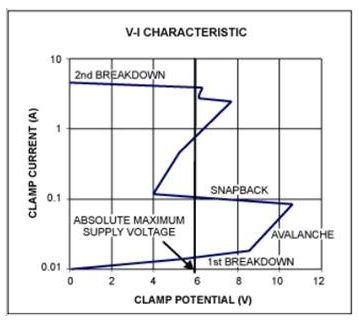 [page]箝位電壓從第一次擊穿變化到突變穩(wěn)定后的導通電壓,如圖5所示。為保證箝位時關閉正常的工作條件,設計的箝位電壓一般要略高于IC的絕對最大電壓。