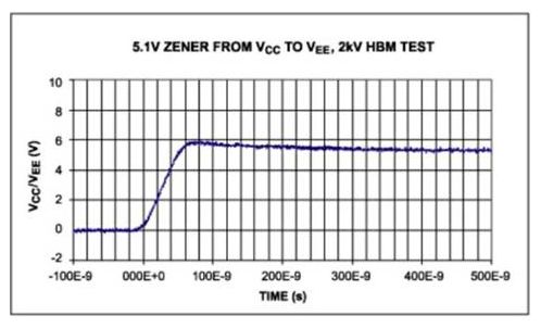 箝位二極管在IC其它電路遭到破壞之前導通,箝位管要有足夠的承受力,保證ESD電流不會導致二次擊穿。2kV HBM測試的箝位過程如圖5所示,圖5中的電壓包括I-R壓降和突變穩(wěn)定后的箝位電壓。