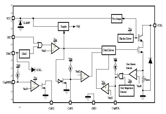 控制級(jí)和功率級(jí)都是由Vcc引腳供電,Vcc引腳通過一個(gè)電阻電容(R-C)網(wǎng)絡(luò)與直流總線相連。在啟動(dòng)階段,電容通過一個(gè)高阻值的電阻器充電,因此,只需幾百微安。由于功率雙極晶體貯存基極電流是在通過‘Vcc充電網(wǎng)絡(luò)’連接Vcc引腳的電容上恢復(fù)的,因此,在工作階段,器件是自己給自己供電。