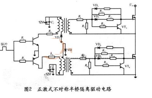 根據(jù)以上幾種驅(qū)動電路,針對傳統(tǒng)隔離驅(qū)動電路結(jié)構(gòu)復(fù)雜、占用空間大和不對稱半橋?qū)S眯酒?qū)動電路應(yīng)用的局限性等問題,提出了一種新型的不對稱半橋隔離驅(qū)動電路,適用于單脈沖輸出的芯片,具有結(jié)構(gòu)簡單可靠,占用空間小等特點,并且實現(xiàn)了電氣隔離,可以運(yùn)用于中大功率場合。