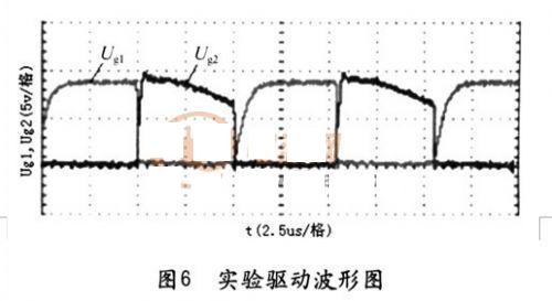 本文設(shè)計了一臺不對稱半橋變換器樣機(jī):工作頻率為98kHz,輸人電壓為400VDC,輸出電壓為30VDC。測得占空比為0.47時的驅(qū)動波形Ug1,Ug1如圖(6)所示。