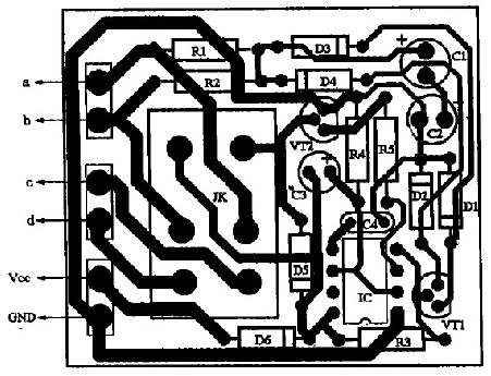 具體制作如下:先把功放輸出端與音箱的引線切斷,按圖2所示電路將引線頭a、b分別接功放的兩組輸出端,c、d分別接左、右聲道音箱:揚聲器保護電路的電源只能從收放機中獲取,不可直接從汽車12 v電源中獲取,否則不起開/關機保護作用;若是柴油車所配置的收放機(使用24 V電源),則要求增加一個降壓電路(見圖3所示),給揚聲器保護電路供電,以免電源電壓過高損壞IC。