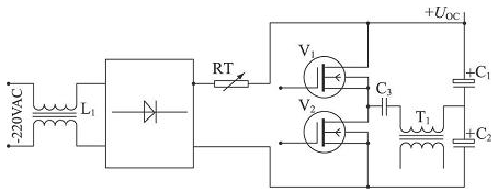 本系統(tǒng)開關電源采用負溫度系數(shù)電阻組成的軟啟動保護電路, 簡單實用, 工作可靠。如圖1, 220 V 交流電經(jīng)線圈L1濾波共模干擾后, 整流產(chǎn)生約三百伏左右直流電壓, RT 電阻為負溫度系數(shù)熱敏電阻,型號為M02-7Ω。當電源合閘瞬間, 浪涌電流使得熱敏電阻發(fā)熱, 阻值迅速減小, 輸出直流電壓逐漸建立,可有效防止浪涌電流對電源電路的沖擊, 使得整個電源半橋變換電路穩(wěn)定可靠。