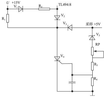 工作原理: 數(shù)控開關電源由輔助電源+ 15 V 提供給可控硅V4管陽極工作電壓, 實際輸出取樣電壓送至穩(wěn)壓管V5 , 當超出保護電壓閾值+ 5. 5 V 時, 輸出電壓經(jīng)穩(wěn)壓管、電阻R3 、R4 分壓觸發(fā)可控硅V4 導通, 將輔助電源+ 15 V 通過電阻R1接地, 同時通過二極管V2切斷8 腳電源。調(diào)節(jié)RP 電位器, 可以對輸出電壓保護閾值點進行設置。