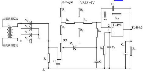 本開關電源過流保護電路的工作原理見圖4。變壓器T 1原邊串接在開關電源主變壓器原邊回路中, 通過實驗選擇合理的變壓器原副邊匝數(shù)比,感應開關電源變換時的原邊電流值, 經(jīng)二極管V1 ~ V4 整流, R1、C1 濾波后送電位器RP。原邊電流越大,電流取樣變壓器整流出的電壓越大, 電位器RP 中心點電壓越低,TL494: 2 腳電壓隨之下降, 使得TL494: 3 腳電壓升高,送入脈寬調(diào)制器, 將T L494 驅(qū)動脈沖寬度逐漸減少, 從而得到過流保護的目的。圖中電容C4、C5、R10為TL494 誤差放大器的反饋元件, 使得放大電路穩(wěn)定可靠。