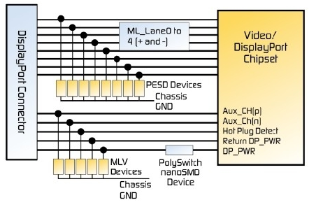 圖4. 典型的運(yùn)用MLV元件, PESD抑制元件以及PolySwitch過(guò)電流保護(hù)元件的顯示端口電路保護(hù)設(shè)計(jì)