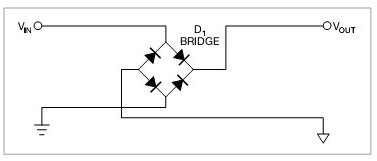 圖2,用一個橋式整流器,不管輸入是什么極性系統(tǒng)都可以正常工作。此電路二極管功耗是圖1中電路的兩倍。