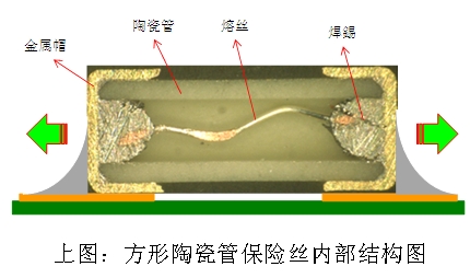 在市場(chǎng)上常見的2410尺寸125Vac或250Vac額定電壓貼片保險(xiǎn)絲, 多是應(yīng)用傳統(tǒng)方形陶瓷管技術(shù)。這一類型貼片保險(xiǎn)絲的兩端是采用金屬帽直接套在方型陶瓷管上, 再以焊錫將金屬帽與內(nèi)部熔絲焊接在一起。一旦產(chǎn)品在高溫的SMT產(chǎn)線上作業(yè),連結(jié)兩端金屬帽與內(nèi)部熔絲的焊錫極有可能會(huì)因高溫而再次發(fā)生熔融情形, 進(jìn)而導(dǎo)致金屬帽脫落的風(fēng)險(xiǎn)。