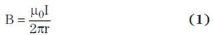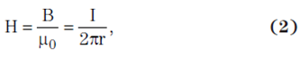 其中,B 為以第平方米伏秒 (V•s/m2) 表示的磁通密度,μ0 為自由空間中的磁導(dǎo)率(計(jì)算方法為 4π × 10–7 V•s/A•m),I 為以安培為單位的電流,r 為以米為單位的導(dǎo)體距離,而 H 為以安培每米 (A/m) 為單位的磁場強(qiáng)度。
