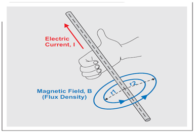 諸如電動(dòng)機(jī)的電源線等帶電導(dǎo)體,其周圍便是一個(gè)由流經(jīng)它的電流形成的磁場。應(yīng)用右手定則(請參見圖 1),我們很容易便可以確定該磁場的方向。該定則的內(nèi)容如下:用右手握住導(dǎo)體,然后拇指指向電流的方向,這時(shí)環(huán)繞導(dǎo)體的手指便指向磁場的方向。因此,磁通線的平面始終與電流垂直。