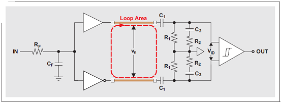 電容隔離器由兩塊硅芯片—一個(gè)發(fā)送器和一個(gè)接收機(jī)組成(請參見圖 2)。數(shù)據(jù)傳輸在由兩個(gè)電容構(gòu)成的差動(dòng)隔離層之間進(jìn)行,在每個(gè)電容的二氧化硅 (SiO2) 電介質(zhì)兩端都有一塊銅頂片和一個(gè)導(dǎo)電硅底片。發(fā)送器芯片的驅(qū)動(dòng)器輸出通過一些接合線連接到接收機(jī)芯片上隔離電容的頂片。通過將電容的底片連接接收機(jī)輸入構(gòu)成了一個(gè)導(dǎo)電環(huán)路。圖 3 顯示了隔離層的等效電路結(jié)構(gòu)圖,并標(biāo)示出了金接合線之間的環(huán)路區(qū)域。很明顯,穿過該環(huán)路的磁場將會(huì)產(chǎn)生一個(gè) EMF,其表示下面 RC 網(wǎng)絡(luò)的輸入電壓噪聲 Vn1。我們常常碰到的第二種差動(dòng)噪聲部分 Vn2,其產(chǎn)生原因是共模噪聲到差動(dòng)噪聲的轉(zhuǎn)換。兩個(gè)噪聲分量共同組成了綜合噪聲 Vn。如果只考慮 EMF 的影響,則可以保守地將 Vn 一分為二: