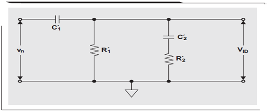 一次電路仿真證實(shí)了 RC 網(wǎng)絡(luò)為一個(gè)一階高通濾波器,其 C′1 和 R′1 為主要組件,頻率高達(dá) 100 MHz(參見圖 5 中藍(lán)色曲線)。超出這一頻率以后,寄生組件 C′2 和R′2生效,從而引起稍稍偏離于線性的斜率。因此,頻率達(dá)到 100 MHz 以后,增益響應(yīng)可以表示為 VID/vn 的比: