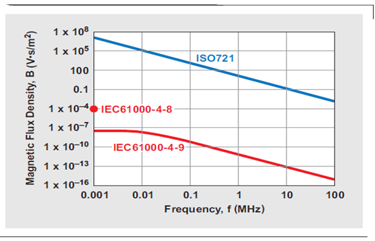 超出電容隔離器差動(dòng)電路噪聲預(yù)算的磁耦合要求 1MHz 下大于 11.7 V•s/m2(117千高斯) 的磁通量密度。這需要在一個(gè)距離器件 0.1m 的導(dǎo)體中有超過 5 百萬安的電流才能產(chǎn)生這樣一個(gè)磁場。在自然界或者任何制造設(shè)備中這都是不可能存在的。如果的確存在,那么設(shè)計(jì)人員便可做以下情況假設(shè):在隔離層失效以前,周圍的電路便都已失效。
