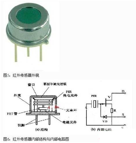 被動(dòng)式紅外傳感器有三個(gè)關(guān)鍵性的元件:菲涅爾濾光透鏡,熱釋電紅外傳感器(PIR)和匹配低噪放大器。菲涅爾透鏡有兩個(gè)作用:一是聚焦作用,即將熱釋紅外信號(hào)折射在PIR上:二是將探測(cè)區(qū)內(nèi)分為若干個(gè)明區(qū)和暗區(qū),使進(jìn)入探測(cè)區(qū)的移動(dòng)物體(人)能以溫度變化的形式在PIR上產(chǎn)生變化的熱釋紅外信號(hào)。一般還會(huì)匹配低噪放大器,當(dāng)探測(cè)器上的環(huán)境溫度上升,尤其是接近人體正常體溫(37℃)時(shí),傳感器的靈敏度下降,經(jīng)由它對(duì)增益進(jìn)行補(bǔ)償,增加其靈敏度。輸出信號(hào)可用來(lái)驅(qū)動(dòng)電子開(kāi)關(guān),實(shí)現(xiàn)LED照明電路的開(kāi)關(guān)控制。圖5是紅外傳感器外貌,圖6 是紅外傳感器內(nèi)部結(jié)構(gòu)與內(nèi)部電路圖。圖7 是帶紅外傳感器的LED照明燈具,這是一款E27標(biāo)準(zhǔn)螺口燈頭的燈具,它的電源適用范圍是 AC180V-250V (50/60Hz), 紅外傳感器檢測(cè)范圍大約在3M—15M,它的標(biāo)準(zhǔn)產(chǎn)品 IFS-Bulb 3W燈具達(dá)80 lm ,5W燈具達(dá)140 lm 。在LED光源模塊的中央部分嵌入紅外線傳感器。一旦紅外傳感器檢測(cè)到人的體溫,LED電燈泡將會(huì)在50秒內(nèi)自動(dòng)開(kāi)啟與關(guān)閉。適用于任何一種室內(nèi)應(yīng)用,如走廊、儲(chǔ)藏室、樓梯和大廳入口處。
