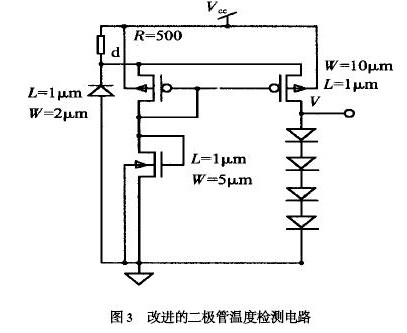 假設在總電路中標準的參考電壓為2. 0 V。則二極管溫度檢測電路的參數要調節(jié)到( V T + + V T - ) / 2= 2. 0 V。調節(jié)的方法很多,3 個用作鏡像電流源的MOS管的尺寸可以很方便的調節(jié),MOS 管尺寸改變則流過二極管的電流就會改變,從而引起上下跳變點電壓的改變。甚至還可以調節(jié)二極管,比如去掉1 個二極管,就用3 個二極管來做溫度檢測。如圖3 所示的尺寸時,50 ℃時為2. 16 V ,120 ℃時為1. 535 V ,即V T + = 1. 535 V , V T - = 2. 16 V。則( V T + + V T - ) / 2= 1. 85 V ,不到2. 0 V。最方便的調節(jié)方法就是放大二極管前面1 個NMOS 管的尺寸。尺寸越大則跳變點電壓就越高。當然也可以調節(jié)另外的2 個MOS 管的尺寸??傊沟? V T + + V T - ) / 2 = 2. 0 V?! ?br />