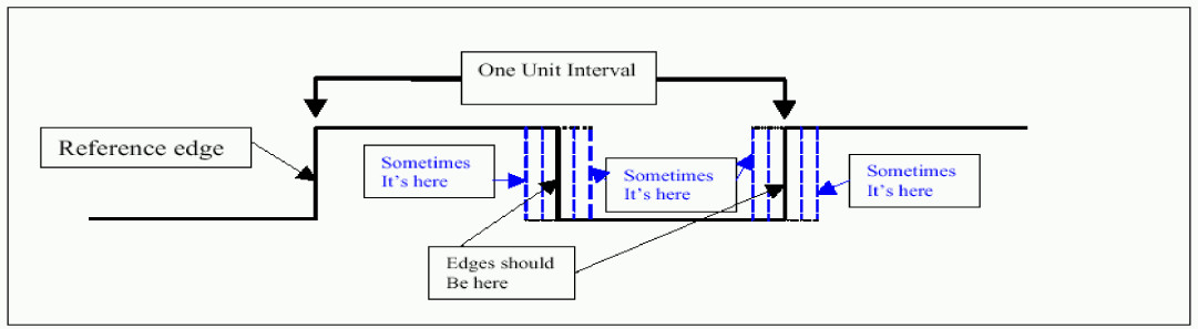 簡單地說,抖動是邊沿與本應位置相比的偏差,如圖1所示。根據(jù)ITU的定義,抖動 是"數(shù)字信號在有效時點較理想時間位置的短期變化".