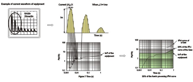 由于開關(guān)電源的出現(xiàn),使得線路中的浪涌電流變得復(fù)雜,多變,不同的浪涌電流或工作電流波形產(chǎn)生的能量是不同的,電路設(shè)計(jì)者要了解回路中出現(xiàn)的浪涌電流或工作電流的波形,以適當(dāng)?shù)剡x擇熔斷的工作電流。參照?qǐng)D (3)