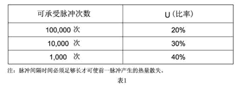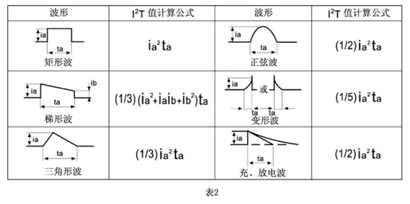 脈沖產(chǎn)生熱循環(huán),從而產(chǎn)生機械疲勞影響保險絲管壽命。設(shè)計時應(yīng)使脈沖I2T遠遠小于保險絲管標稱熔化熱能I2T。保險絲管壽命(可承載的脈沖循環(huán)次數(shù))與U(脈沖I2T值之比率)的關(guān)系參照表1.本目錄提供的各種規(guī)格的保險絲管熔化熱能I2T可供參考,表2提供各種典型脈沖波形的I2T值近似計算公式: