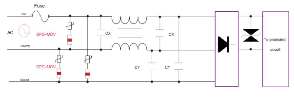 9、專(zhuān)用于高頻通訊信號(hào)線路進(jìn)行防護(hù),一般不能直接用在有源電路上進(jìn)行防護(hù),在有源線路中它必須配合限壓型(MOV、HYPERFIX)的保護(hù)器件來(lái)同時(shí)使用。