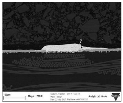 厚膜電阻的使用經(jīng)驗表明,短時過載、焊接熱等熱應(yīng)力和脈沖應(yīng)力會使阻值發(fā)生漂移。這些在貼片式保險絲里發(fā)生的現(xiàn)象將會改變保險絲的特性,進(jìn)而縮短熔斷時間。雖然熔體使用了幾種不同的材料,例如銅錫合金,可以達(dá)到高水平的I2T,但在持續(xù)的熱應(yīng)力之后,熔體對斷開時間的縮短是非常敏感的。這是由于應(yīng)力會導(dǎo)致熔體組成材料的遷移,如圖2所示,該圖顯示了在施加脈沖負(fù)載應(yīng)力之后,銅錫合金正在發(fā)生遷移的情況。