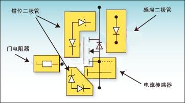 突出顯示的元件組成一個(gè)特性板,可以將其中的功能集成到MOSFET中。這些元件從右上角開始按順時(shí)針方向?yàn)椋簻囟雀袘?yīng)二極管、電流傳感器、鉗位二極管(內(nèi)部二極管,未顯示)和門電阻器。通過加入鉗位二極管和門電阻器眾所周知的保護(hù)特性,可以保護(hù)對電壓敏感的柵氧化層免受危險(xiǎn)電場的破壞。