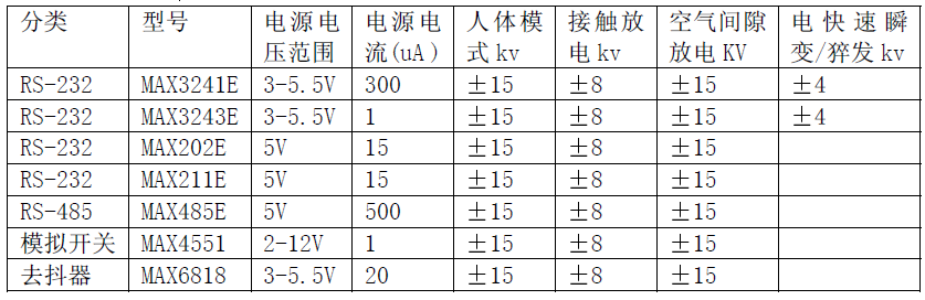 收的COM 端口需要8 個(gè)TransZorb?二極管費(fèi)用高達(dá)$2一種有效的方法是采用內(nèi)部集成ESD 防護(hù)功能的串行接口器件這種器件比普通無(wú)防護(hù)功能的器件價(jià)格要貴但增加的費(fèi)用比起外加防護(hù)二極管的費(fèi)用要低內(nèi)部集成的ESD,防護(hù)電路不會(huì)增加任何輸入輸出管腳的等效電容也節(jié)省了電路板面積MAXIM公司近幾年發(fā)展了享有專(zhuān)利的集成ESD防護(hù)技術(shù)并可提供全系列的ESD防護(hù)串行接口器件包括與標(biāo)準(zhǔn)器件完全兼容的產(chǎn)品MAXIM公司還將同樣的技術(shù)應(yīng)用到模擬開(kāi)關(guān)和開(kāi)關(guān)去抖產(chǎn)品中所有這些器件的ESD 防護(hù)能力都符合15kV IEC1000-4-2 氣隙放電8kVIEC1000-4-2 接觸放電15kV人體模型HBM 測(cè)試標(biāo)準(zhǔn)下表是MAXIM公司具有抗靜電功能的器件。