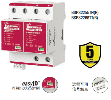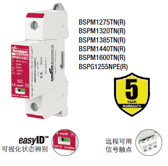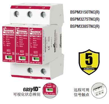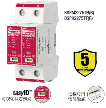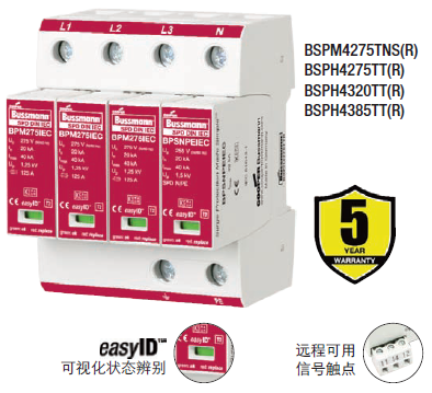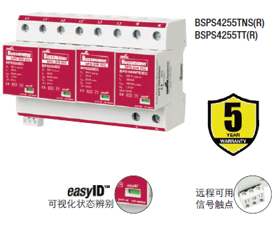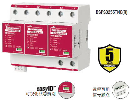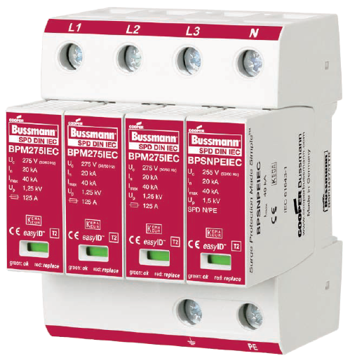 Cooper Bussmann IEC I級230伏、三極、結(jié)合了雷電流和浪涌保護(hù)器的模塊具有兩個特色:局部的、easyIDTM可視化辨別