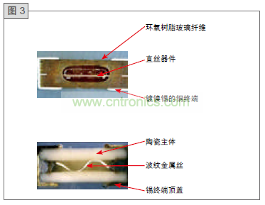 圖3為直絲設(shè)計(jì)的2410SFV保險(xiǎn)絲和一般波紋絲設(shè)計(jì)的對(duì)比。直絲器件在空氣中熔斷性能更一致,具有更低電阻和良好的浪涌抵