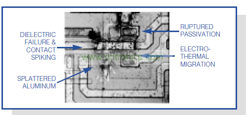 圖1中的顯微圖片表明競爭對手的RS-232接口芯片在受到15kV(一般測試水平)的ESD沖擊后的損壞情況,強大的壓力使芯片內(nèi)的金屬汽化,結(jié)果造成明顯的大面積損壞。其它情況下,考察柵氧化層或