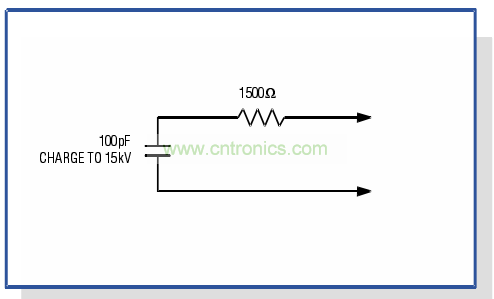 建立。針對不同情形可以用幾種公認的模型描述帶電人體,最為通行的模型(圖2)是充電到15,OOOV的100pF電容與1500。電阻串聯(lián)。
