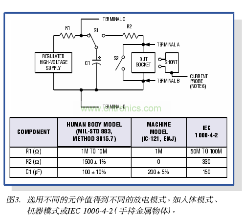 有兩種方法一均符合上述要求一已被設(shè)備制造商廣泛采用,來測試I/O端口的ESD防護能力(圖3)第一種方法修改自Method 3015.7 > MIL-STD-883它采用了與原來方法相同的電路模型和波形,但只將ESD脈沖施加于器件的I/o引腳。這種方法的口的是模擬已安裝于線路板并運行于口標系統(tǒng)中的Ic所遭遇的故障電流。