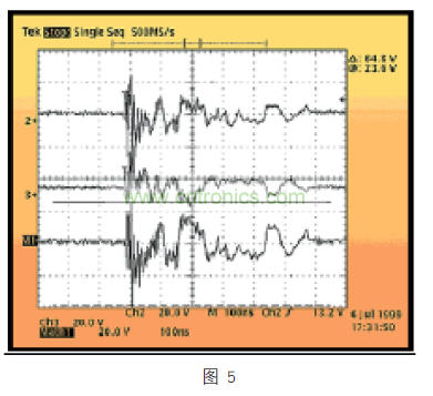 另一個要了解的重要因素是 CDE 波形,因?yàn)樗幌褚郧坝懻摰娜魏瓮{,取決于耦合機(jī)制,要么是異模,要么是共模。此外,初步研究顯示,它在特點(diǎn)上有很大差異,但總體上看,CDE 的波形能量高,體現(xiàn)在電壓和電流驅(qū)動上。波形傳播的時間為幾百納秒,能夠快速反轉(zhuǎn)極性。下面的圖 5,給出了破壞性 CDE 波形的例子,在一個以太網(wǎng) PHY 發(fā)射器引腳,一個 25 英尺雙絞線電纜靜電電壓達(dá) 1.5KV。在該事件發(fā)生超過 600ns 時間的期間,在異模波形上看到有 64.8V 從正電壓轉(zhuǎn)換為負(fù)電壓。在這個實(shí)驗(yàn)中,PHY 的發(fā)射器被破壞,無法在網(wǎng)絡(luò)上傳輸數(shù)據(jù)包。
