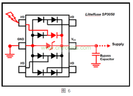 通過連接 SP3050的 VCC 引腳,由于電氣瞬態(tài)兩個獨(dú)立的放電路徑,如下(圖 6)紅色所示,設(shè)計者將更好進(jìn)行夾緊設(shè)計。可以簡單地將它看作一個電阻分壓器,其中瞬態(tài)電流通過導(dǎo)向二極管,并選擇了兩條路,一個通過內(nèi)部 TVS到 GND,一個通過電源或外部旁路電容到 GND??偠灾?5 腳連接到電源,將導(dǎo)致更好的夾緊性能,給以太網(wǎng) PHY 提供更好的整體保護(hù)。