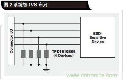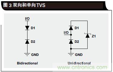 立即沿這條通路接地。在單向 TVS 情況下,只要 D2 和Z1 都不進(jìn)入其擊穿區(qū)域,則電壓信號(hào)會(huì)在接地電壓以上擺動(dòng)。當(dāng)正ESD電擊擊中I/O線路時(shí),D1變?yōu)檎蚱茫鳽1 先于 D2 進(jìn)入其擊穿區(qū)域;通過(guò) D1 和 Z1 形成一條接地通路,從而讓 ESD 能量得到耗散。當(dāng)發(fā)生負(fù)ESD 事件時(shí),D2 變?yōu)檎蚱茫珽SD能量通過(guò) D2接地通路得到耗散。由于 D1 和 D2 尺寸可以更小、寄生電容更少,單向二極管可用于許多高速應(yīng)用;D1 和 D2 可以“隱藏”更大的齊納二極管 Z1(大尺寸的原因是處理?yè)舸﹨^(qū)域更多的電流)。