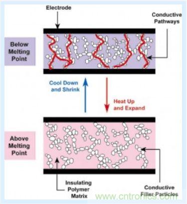 這是 PPTC 器件的工作原理,PPTC 器件是由一個(gè)由專(zhuān)業(yè)配方塑料和導(dǎo)電粒子混合而成的導(dǎo)電聚合物,如下圖所示,在正常溫度下,PPTC 器件中的導(dǎo)電粒子在聚合物中形成了低阻抗鏈。然而,如果溫度上升到器件的開(kāi)關(guān)溫度之上,聚合物中的微晶體就會(huì)熔化而成為無(wú)定形狀態(tài)。晶體熔化過(guò)程中,體積會(huì)增加,引起導(dǎo)電粒子的分離,從而導(dǎo)致器件電阻呈現(xiàn)非線性增加。