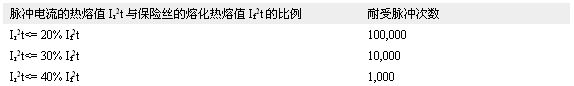 由于脈沖電流通過保險絲的時候,會產(chǎn)生熱量,所以雖然單次脈沖的能量不足以使保險絲熔斷,但多次脈沖沖擊會導致保險絲熔斷。為了保證保險絲可以耐受規(guī)定次數(shù)的脈沖電流,需要依據(jù)表3中所示的脈沖折減系數(shù)計算保險絲的I2t規(guī)格。如果脈沖發(fā)生時,保險絲所處環(huán)境溫度高于室溫(+25°C),須做相應的溫度折減。