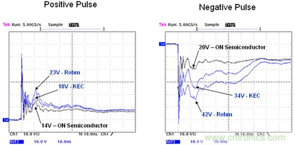 從圖3所示的屏幕圖上可見,顯然,與兩個競爭對手的器件(藍色波形)相比較,安森美半導體保護解決方案(黑色波形)提供更低的ESD脈沖鉗位電壓。與競爭對 手2的18 V和競爭對手1的23 V相比較,安森美半導體的器件將正脈沖鉗位在14 V。而在負脈沖期間,這三個器件之間鉗位電壓的差異更加明顯。安森美半導體、競爭對手2和競爭對手1的器件對負脈沖的鉗位電壓分別是20 V、34 V和42 V。在負ESD脈沖期間這三種器件之間有明顯的區(qū)別,競爭對手2的器件的鉗位電壓比安森美半導體的器件高70%,而競爭對手1的器件的鉗位電壓則是安森美 半導體器件的兩倍之多。通過競爭對手的保護器件后的剩余負脈沖電壓對那些更容易受到ESD破壞的新IC設計有潛在的危險。然而,安森美半導體的器件卻能在 負脈沖和正脈沖兩個方向上保持低的鉗位電壓,從而將遭受正/負ESD脈沖的破壞風險都保持在最低水平。