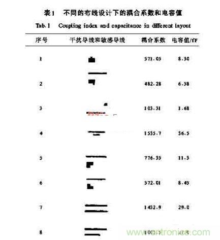(1)印制板布局時(shí),要將模擬電路區(qū)和數(shù)字電路區(qū)合理地分開(kāi),電源和地線單獨(dú)引出,電源供給處匯集到一點(diǎn);PCB布線時(shí),高頻數(shù)字信號(hào)線要用短線,主要信號(hào)線最好集中在PCB板中心,同時(shí)電源線盡可能遠(yuǎn)離高頻數(shù)字信號(hào)線或用地線隔開(kāi)。其次,可以根據(jù)耦合系數(shù)來(lái)布線,盡量減少干擾耦合。(見(jiàn)表1)