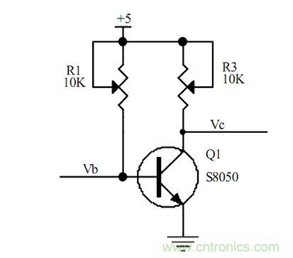 2、當(dāng)我們調(diào)節(jié)可調(diào)電阻,R1,使R1=4.3K時,通過歐姆定律我們可以計算得到,Ib=(5-0.7)/4.3K=1mA,那我們就可以計算出IC=Hfe*Ib=10mA,假如這個時候我調(diào)節(jié)R3,使R3=1K歐姆,通過計算我們可以得到Vc=5-(10mA*1K)=-5V,回出現(xiàn)-5V嗎,當(dāng)然不會,因為沒有負(fù)壓,所以Vc的電壓會停留在0V,那這個時候我們再來看下Ic到底是多少?