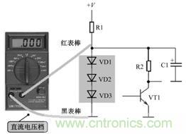 檢測這一電路中的3只二極管最為有效的方法是測量二極管上的直流電壓,如圖9-41所示是測量時(shí)接線示意圖。如果測量直流電壓結(jié)果是1.8V左右,說明3只二極管工作正常;如果測量直流電壓結(jié)果是0V,要測量直流工作電壓+V是否正常和電阻R1是否開路,與3只二極管無關(guān),因?yàn)?只二極管同時(shí)擊穿的可能性較小;如果測量直流電壓結(jié)果大于1.8V,檢查3只二極管中有一只開路故障。