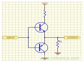集電極開路輸出的結(jié)構(gòu)如圖1所示,右邊的那個(gè)三極管集電極什么都不接,所以叫做集電極開路(左邊的三極管為反相之用,使輸入為"0"時(shí),輸出也為"0")。對(duì)于圖1,當(dāng)左端的輸入為“0”時(shí),前面的三極管截止(即集電極C跟發(fā)射極E之間相當(dāng)于斷開),所以5V電源通過1K電阻加到右邊的三極管上,右邊的三極管導(dǎo)通(即相當(dāng)于一個(gè)